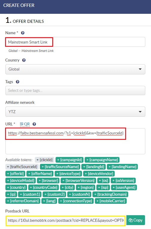 The final step is adding your BeMob postback to YTZ so that you can start sending traffic!