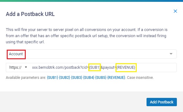 xxx.yourpostbacklink.com/postback?cid={SUB1}&payout={REVENUE}
