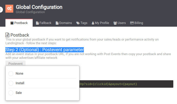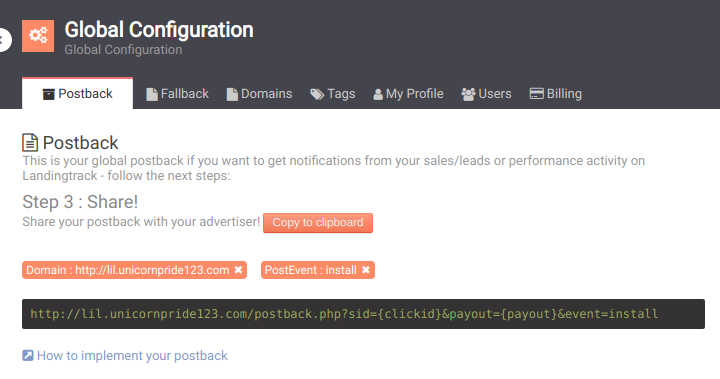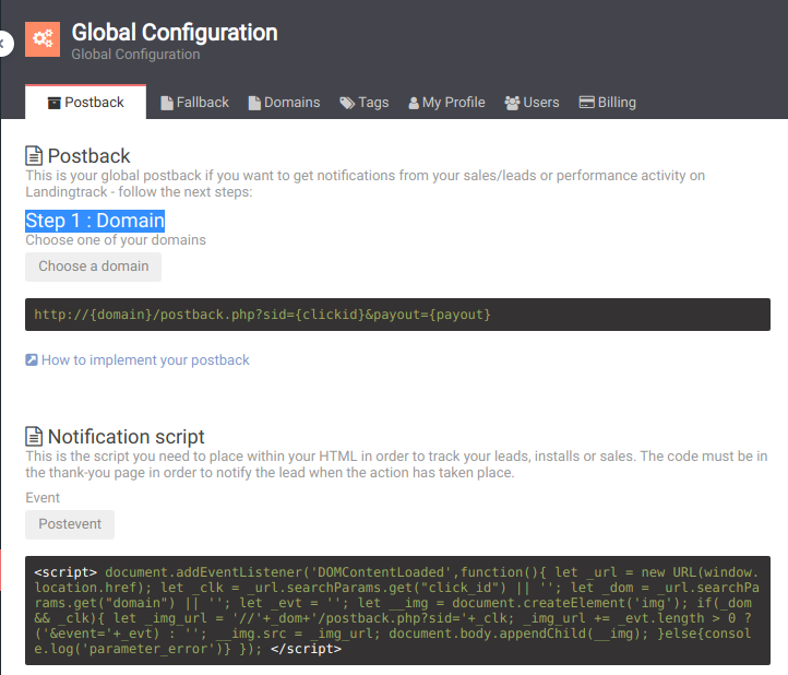 - Next, go to Settings to grab your postback link. You will need to replace {domain} with your unique LandingTrack domain (see the Domains tab in this section).