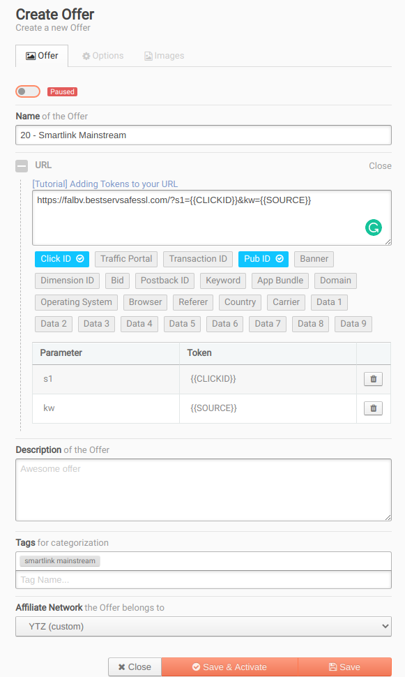 - Name your offer and paste your YTZ tracking link into the URL field. Select YTZ under the Affiliate Network drop down menu.