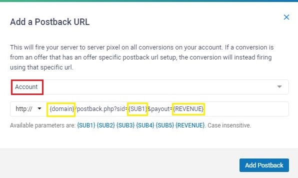 yourdomain.com/postback.php?sid={SUB1}&payout={REVENUE}