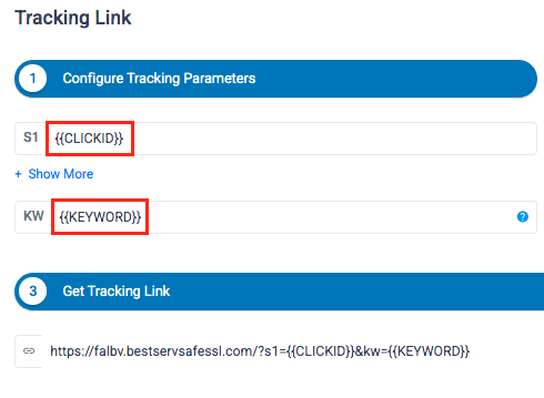 - The next step is to configure the tracking parameters. Start by adding LandingTrack’s {{CLICKID}} token in the S1 box. It is also recommended that you pass source IDs through the KW field. Add {{KEYWORD}} in the KW box. These will automatically update the URL in the Get Tracking Link section below, where you can easily copy the link.