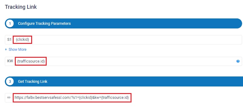 The next step is to configure the tracking parameters. Start by adding RedTrack’s {clickid} token in the S1 box. It is also recommended that you pass source IDs through the KW field. Add {sourceid} in the KW box. These will automatically update the URL in the Get Tracking Link section below, where you can easily copy the link.