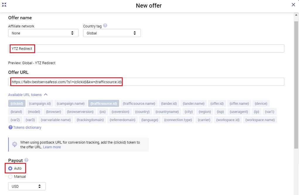 - Paste your YTZ tracking link into the field for Offer URL.