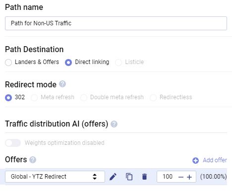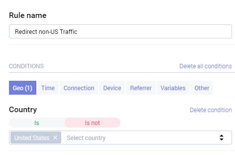 You can set rules for all types of redirects. But for this example, we are setting a rule on a US offer to redirect all non-US traffic.